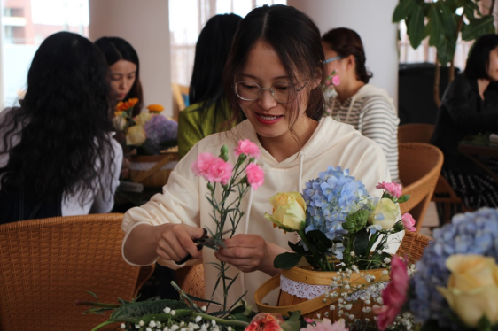 接下来,开展以“巾帼之花 美丽绽放”为主题的插花活动,学院邀请了拥有多年插花经验的花艺老师何昌荣老师,给大家讲授选花、裁剪、颜色搭配、造型等方面的插花技巧。
