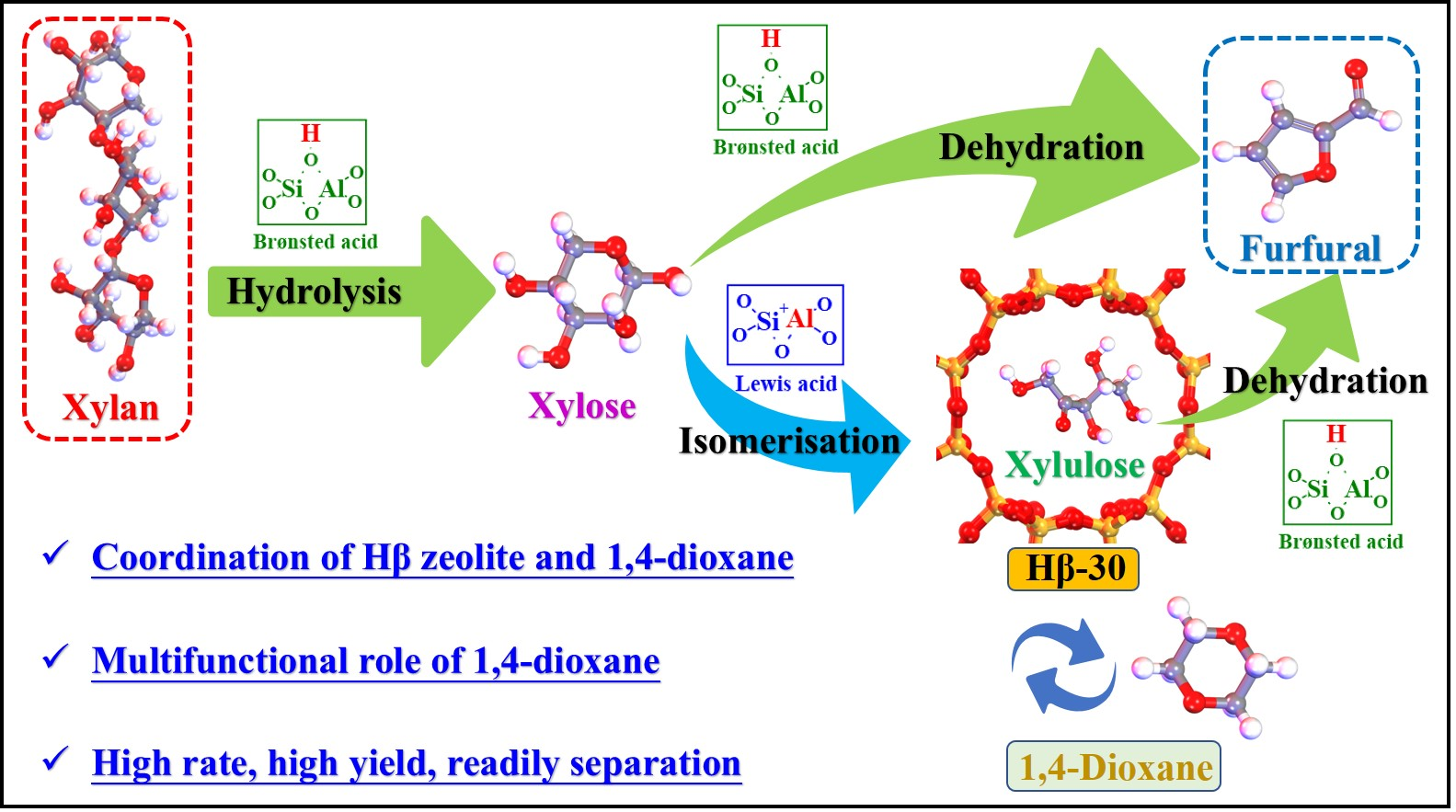 基于此背景,生物质化工团队开发了一种利用工业级Hβ沸石在1,4-二氧六环有机溶剂中高效转化半纤维素组分选择性制备糠醛的新策略,在温和条件下可实现86%的木聚糖和94%的木糖转化成糠醛,反应转换频率达54 h–1,反应活化能降低至39kJ/mol。反应后,产物糠醛、Hβ沸石催化剂和1,4-二氧六环溶剂易实现分离纯化,回收的催化剂和溶剂在多次重复使用中保持稳定的反应活性。基于系统实验表征和DFT计算研究,深入揭示了Hβ沸石与1,4-二氧六环在糠醛高效制备过程中的协同作用和配位机制,阐明了1,4-二氧六环溶剂在反应转化中的多重作用机理。该研究成果实现了生物质基半纤维素的清洁高效利用和过程效益的综合提升,可为平台化学品糠醛的工业制备提供新技术与理论支撑。