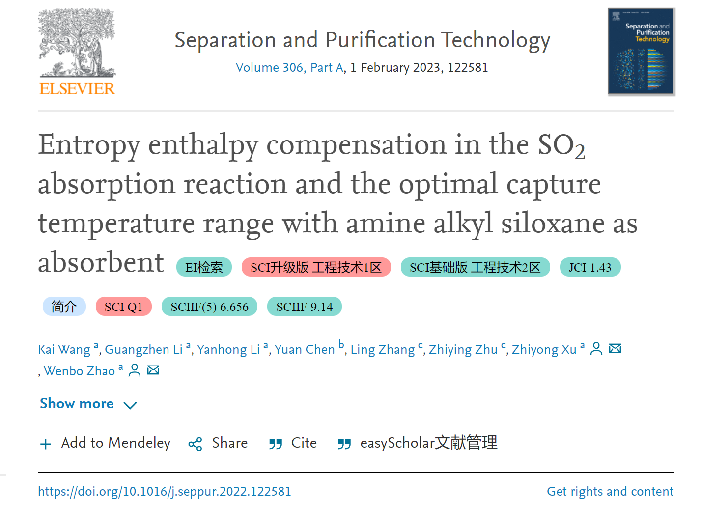 近日,赵文波教授课题组在SO2捕集方面的最新研究成果“Entropy enthalpy compensation in the SO2absorption reaction and the optimal capture temperature range with amine alkyl siloxane as absorbent”在化工领域国际Top学术期刊Separation and Purification Technology上发表。论文的第一作者为色色视频