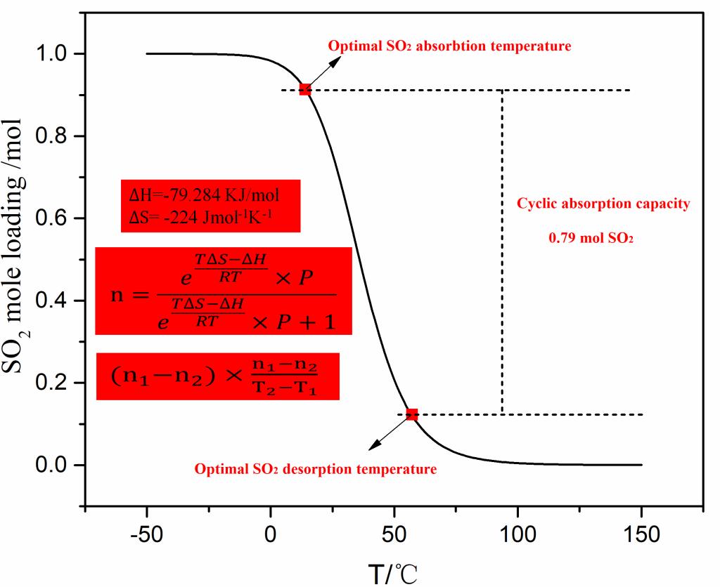 另外课题组通过两步反应合成了一种低粘度、高热稳定性的二丁基-(1,1-二甲基-3,3,3-三苯基-二硅氧烷基甲基)-胺(DDTDA)。发现其与SO2的反应焓和熵变分别为-85.39 KJ/mol和-244 J mol-1K-1,其绝对值相比于DPSA得到进一步增加。数学实验证明,简单地比较两种吸收剂在一定温度下的容量来评估它们的吸收性能是不科学的。不同的吸收剂具有不同的最佳捕集温度范围,该范围由其反应焓变和熵变决定。相关研究成果以“A standard function to evaluate optimal absorption and desorption temperature of SO2absorbent: Taking amine alkyl organosilicon as example”为题发表在化工领域国际Top学术期刊Separation and Purification Technology上(论文链接://doi.org/10.1016/j.seppur.2022.120634)。论文第一作者为色色视频