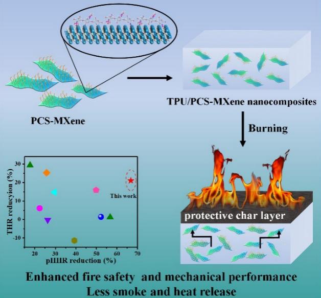 磷化工团队提出通过磷酸化壳聚糖功能化MXene阻燃热塑性塑料,制备了一种具有高机械强度、阻燃和抑烟性能的热塑性聚氨酯复合材料。研究结果表明,相较于纯热塑性聚氨酯,该复合材料的热释放速率峰值、总热释放量及总烟释放量分别降低66.7%,21.0%,27.7%,表现出优异的阻燃和抑烟效果;同时,功能化MXene对基材具有增强和增韧作用,赋予了复合材料突出的力学性能。此外,还系统探索了功能化MXene对热塑性聚氨酯在气相和凝聚相中的阻燃机理,对于开发高性能聚合物复合材料具有一定的指导意义。