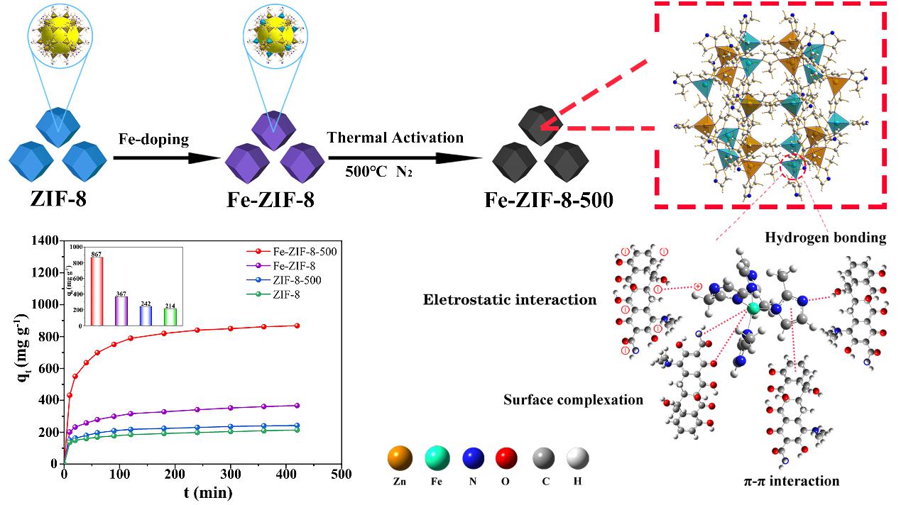 四环素约占抗生素总产量和使用量的三分之一,由于其良好的结构稳定性,在水体中难以被降解,近年来经常在水环境中被检测到。四环素的抗菌活性会杀死水体中的微生物,造成水生生态系统的破坏。此外长期暴露在四环素的环境下会引发细菌的耐药性。因此,开发有效途径对水中四环素进行去除具有重要现实意义。金属-有机框架(metal-organic frameworks, MOFs)材料是目前吸附四环素最有前景的吸附剂之一。金属掺杂技术修饰MOFs基吸附剂被认为是一种简单有效的手段,可赋予其额外的吸附位点,提高其吸附性能。另一方面,大多MOFs含有电子缺陷配位不饱和位点(CUSs),这些位点通常被制备产物中的溶剂分子所占据。通过热活化去除溶剂分子,活化的CUSs可以与有机污染物中的氨基、羟基、羰基等富电子基团配位,从而提高MOFs对各种有机污染物吸附性能。基于上述背景,林资源高效转化与利用团队通过Fe掺杂策略改性ZIF-8获到了Fe-ZIF-8吸附剂,在500℃下活化暴露出更多的活性位点,对水中四环素吸附具有高吸附能力和优良循环性能。
