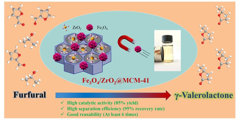 γ-戊内酯是一种先进的新能源化学品,具有广泛的工业应用价值,可作为燃料添加剂、润滑剂、增塑剂、有机溶剂、以及生产烯烃和聚合物的前驱体。生物质化工团队以糠醛为反应原料,采用共沉淀-浸渍法制备的Lewis和Brønsted酸位点可调的磁性锆基介孔分子筛作为多功能催化剂(记为Fe3O4/ZrO2@MCM-41),整合两步加氢反应和一步醇解反应,利用“一锅法”策略在无外源氢气条件下实现了糠醛直接到γ-戊内酯的绿色高效转化,γ-戊内酯得率高达85%。所开发的催化剂同时具有优异的磁学性能,使用后易于通过外加磁场实现高效回收,并在多次重复使用中保持稳定的催化活性。该研究为生物质基糠醛催化提质制备γ-戊内酯提供了绿色高效合成新途径。