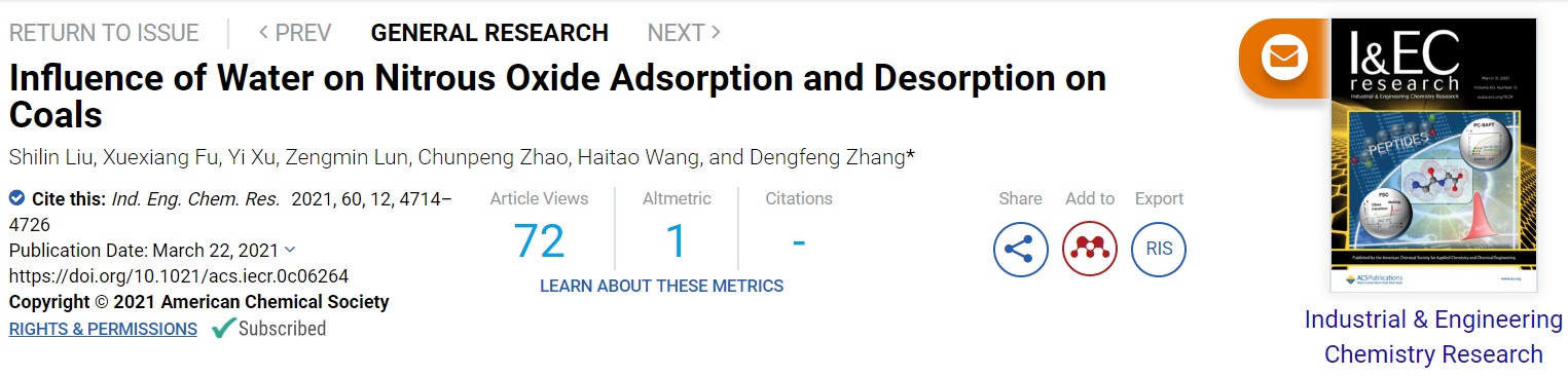 相关成果以“Influence of Water on Nitrous Oxide Adsorption and Desorption on Coals”为题发表于国际化工三大期刊Industrial & Engineering Chemistry Research上。论文的第一作者为色色视频