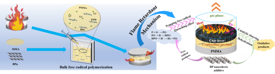 在此背景下,磷化工团队以具有高效阻燃性能的纳米黑磷烯(BPn)为功能填料,通过设计甲基丙烯酸甲酯(MMA)的本体聚合反应,将BPn和离子液体体系(EMIM-TFSI+Li-TFSI)原位复合到PMMA中,成功开发出BPn修饰的阻燃型凝胶聚合物电解质隔膜。测试结果表明,该电解质隔膜除了具有良好的热稳定性和阻燃性能外,还具有优异的电化学性能,这主要是因为BPn具有独特的褶皱状“蜂窝”结构,为载流子快速迁移提供了通道。结合DSC、NMR、FTIR等表征手段,进一步揭示了BPn复合聚合物凝胶电解质隔膜的导Li+机制,从而为开发高安全性的LIBs商用电解质隔膜提供了一种便捷而高效的设计思路。