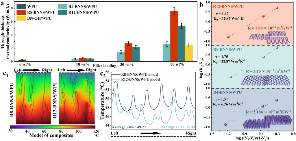 磷化工团队通过碱辅助水热处理与高速剪切相结合,实现了2.54 nm厚度氮化硼纳米片(BNNS)的规模化高产率(65%)剥离。同时,成功在氮化硼纳米片引入羟基官能团,使其适用于水性聚氨酯(WPU)中,制备了导热柔性薄膜,在50 wt%的BNNS添加量下导热率提高了30倍,达到了7.58 W/m·K的垂直方向导热率。该薄膜表现出优异热稳定性、拉伸强度和火安全性能,可被用作大功率LED的热界面材料,对比商用硅脂表现出更好的热管理能力。结合Comsol仿真导热模拟和Foygel理论计算,重点研究了不同大小、厚度BNNS之间的界面热阻,揭示了BNNS导热增强的尺寸相关性。该研究为可控氮化硼纳米片的剥离和高效热管理复合材料的设计提供了新的方法和理论指导。