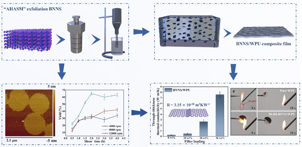高密度、小型化和集成化的快速发展对电子设备的热管理材料带来了新的挑战。氮化硼纳米片(BNNS)超高的面内导热率(理论大于2000 W/m·K)和优异的电气绝缘性能,已经被广泛用于热管理材料的增强填料。然而,由于氮化硼的表面化学惰性和相邻层间强烈的范德华力相互作用,BNNS的高效、可控剥离及表面功能化仍然是一个挑战。