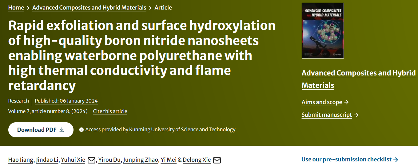 上述研究成果以“Rapid exfoliation and surface hydroxylation of high‑quality boron nitride nanosheets enabling waterborne polyurethane with high thermal conductivity and flame retardancy”为题发表在期刊Advanced Composites and Hybrid Materials(IF:20.1)上,论文第一作者是团队2021级博士研究生姜豪。该研究工作得到了国家自然科学基金(22268025)和云南省基础研究计划项目(202201AT070115, 202101AU070012, 202201BE070001-031)的资助。