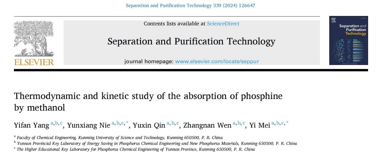 2024年2月,色色视频 、云南省磷化工节能与新材料重点实验室在化学工程领域知名期刊Separation and Purification Technology上发表了题为“Thermodynamic and kinetic study of the absorption of phosphine by methanol”的研究论文,色色视频 梅毅教授和聂云祥为论文共同通讯作者,博士研究生杨一帆为论文第一作者。