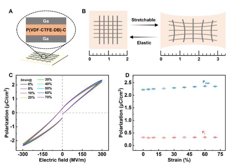 本研究以弛豫性铁电聚合物聚偏氟乙烯-三氟氯乙烯[P(VDF-CTFE)]为研究对象,在前期研究的基础上,作者利用巯基-烯点击反应,实现了含双键的弛豫性铁电聚合物P(VDF-CTFE-DB)与含巯基的交联剂TMPMP的交联,构建了聚合物网状结构,从而实现了弛豫性铁电体的本征弹性化。交联后的铁电薄膜断裂伸长率达260%,在50%应变的疲劳测试中,该弹性弛豫铁电薄膜在3,000次应变循环后仍能保持80%的应变回复率,与市售的氟弹性体P(VDF-HFP)相近。通过对交联薄膜进行电学性能表征,验证了交联薄膜在较宽频率内稳定的铁电响应。最终,以该弹性弛豫性铁电体薄膜为介质层制备的全弹性铁电器件在70%应变下展现了稳定的铁电响应,进一步验证了该弹性弛豫铁电薄膜应用于可穿戴设备的可能性。本研究为构建本征弹性弛豫铁电材料提供了一个简便、高效的新思路。