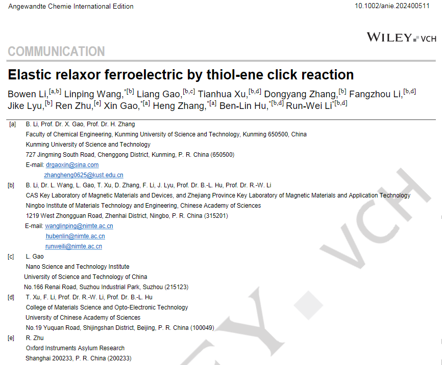 张恒正高级实验师课题组和中国科学院宁波材料技术与工程研究所柔性磁电功能材料与器件团队合作,在铁电材料弹性化领域取得重要研究进展,相关成果以“Elastic relaxor ferroelectric by thiol-ene click reaction”为题发表在国际化学顶级期刊《Angewandte Chemie International Edition》上。色色视频