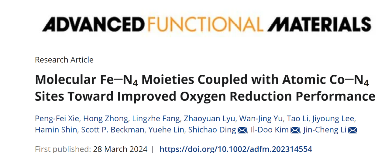 上述研究以“Molecular Fe─N4Moieties Coupled with Atomic Co─N4Sites Toward Improved Oxygen Reduction Performance”为题,发表在材料科学领域权威Top期刊《Advanced Functional Materials》上。论文的第一作者为色色视频