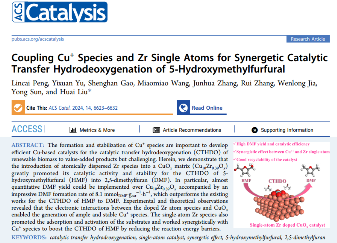 生物质化工团队在催化提质生物质基平台化合物5-羟甲基糠醛加氢脱氧制备2,5-二甲基呋喃方面取得重要研究进展,相关研究成果以“Coupling Cu+Species and Zr Single Atoms for Synergetic Catalytic Transfer Hydrodeoxygenation of 5‑Hydroxymethylfurfural”为题发表在美国化学会催化领域旗舰期刊《ACS Catalysis》上。色色视频