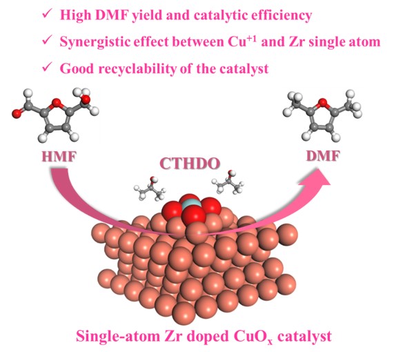 基于此,生物质化工团队提出通过将原子分散的Zr物种引入到CuOx基体中(Cu10Zr0.39Ox),发现可以显著提高其催化HMF转移加氢脱氧制备DMF的催化活性和稳定性。Cu10Zr0.39Ox催化剂几乎可以实现定量的DMF产率,且DMF生成速率可达8.1 mmolDMF.gcat−1.h−1,优于现有报道催化HMF转移加氢脱氧制备DMF的催化反应体系。实验表征和理论计算表明:掺杂的Zr单原子和CuOx之间的电子相互作用能够诱导生成充足且稳定的Cu+物种,同时单原子Zr物种促进底物的吸附和活化,并与Cu+协同降低HMF制备DMF过程的反应能垒。此外,Cu10Zr0.39Ox催化剂在加氢脱氧反应中表现出良好的通用性和循环使用性能。本研究可为通过单原子掺杂策略设计高效稳定的Cu基催化剂用于生物质基平台化合物催化提质提供新思路。