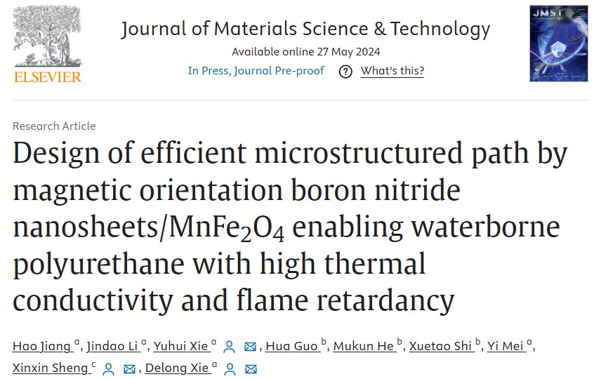 2024年5月,色色视频 、云南省磷化工节能与新材料重点实验室在化学工程领域知名期刊Journal of Materials Science & Technology上发表了题为“Design of efficient microstructured path by magnetic orientation boron nitride nanosheets/MnFe2O4enabling waterborne polyurethane with high thermal conductivity and flame retardancy”的研究论文,色色视频 谢于辉和谢德龙教授为论文共同通讯作者,博士研究生姜豪为论文第一作者。