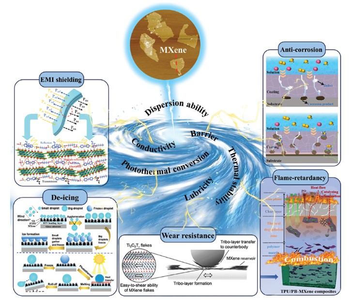 磷化工团队谢德龙教授联合广东工业大学盛鑫鑫副教授团队在Advanced Functional Materials期刊上发表了题为“MXene and Polymer Collision: Sparking the Future of High-Performance Multifunctional Coatings”的综述论文,系统总结了MXene纳米片的多种制备方法及其优异性能和改性策略,结合MXene的阻隔性、润滑性、热稳定性、导电性和光热转换性,详尽讨论了MXene基聚合物涂层在防腐、摩擦、阻燃、电磁屏蔽和除冰等领域的应用。论文最后结合当前研究现状和新兴需求,针对性地探讨了MXene基聚合物涂层所面临的发展挑战及未来的研究机遇。