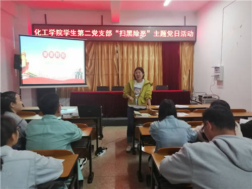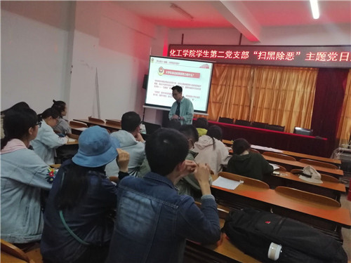 学生第二党支部在化工楼负一楼报告厅开展了“扫黑除恶”主题党日活动。本次活动由学生第二党支部组织委员袁买风同志主持。
