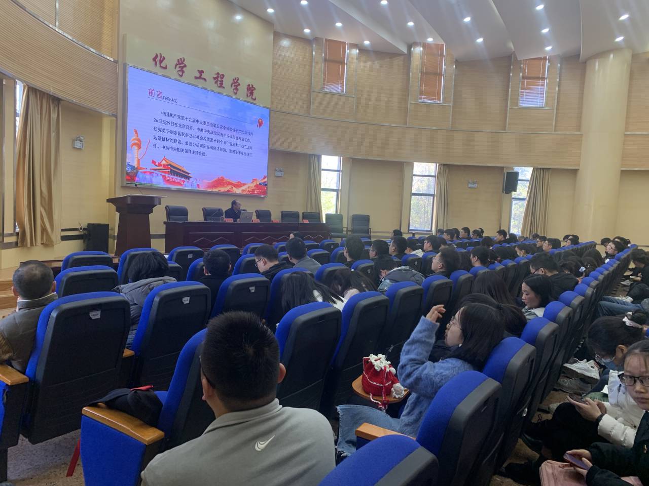 2020年12月24日,色色视频 在化工楼100报告厅组织开展了“学习贯彻党的十九届五中全会精神”专题党课,本次党课由学院党委书记齐毅主讲,化工学生第二党支部全体党员参加了会议。