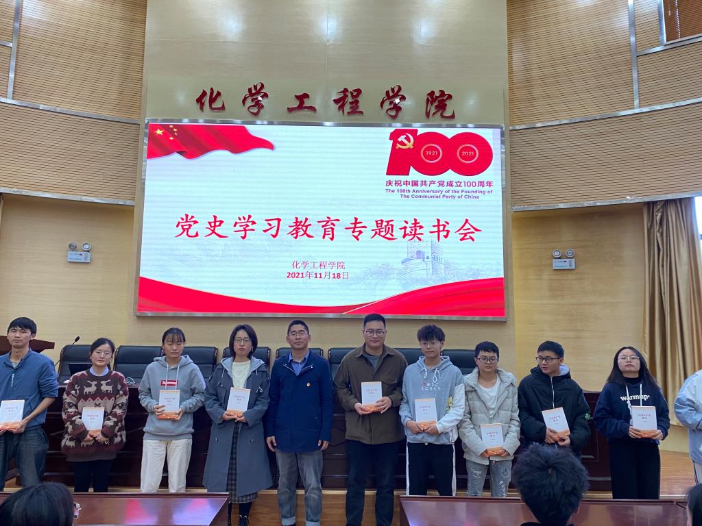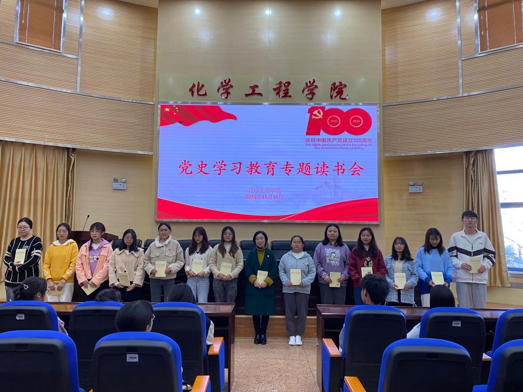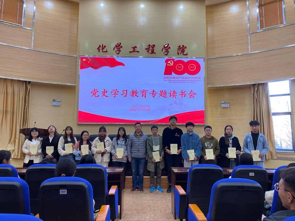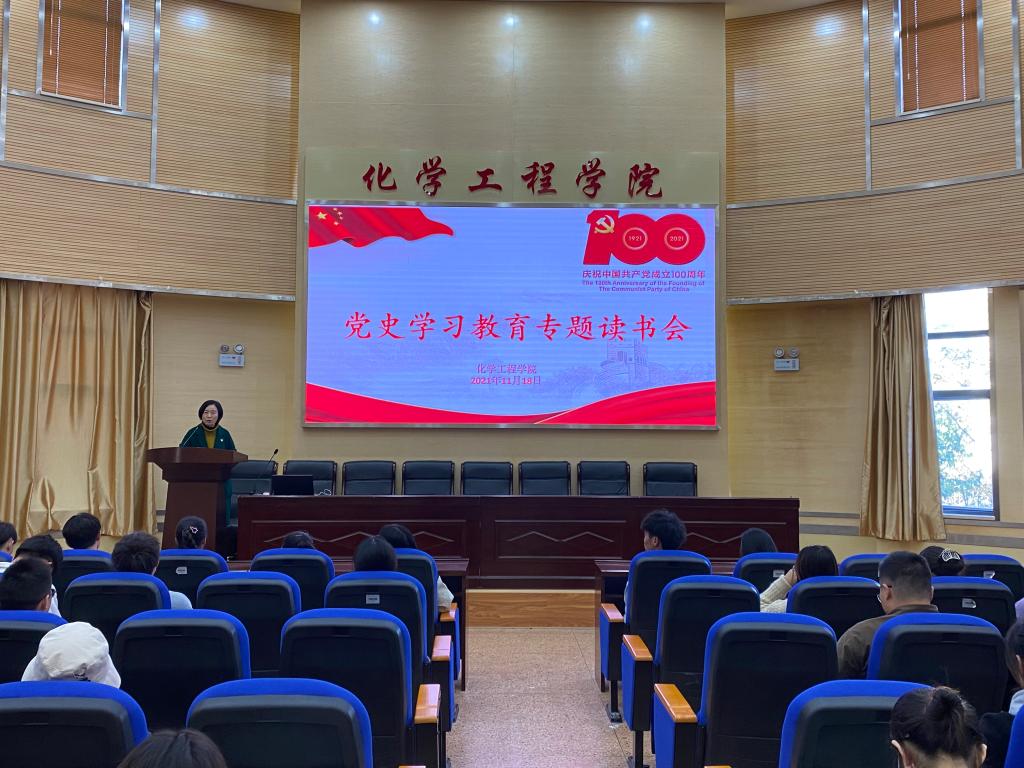 在化工楼100报告厅开展了“党史学习教育专题读书会”活动。学院党委书记李云燕同志、学院党委委员常静华同志、学生第二党支部书记田世垚同志、学生第三党支部书记袁敬同志和部分学生党员参加了本次读书会。
