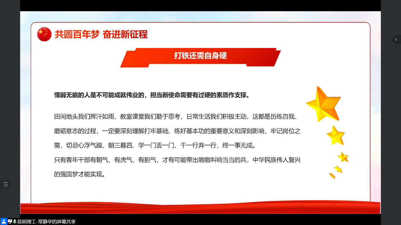常静华老师强调,国家的兴旺发达关键在党,关键在我们青年一代。在实际学习中应认真贯彻落实两会精神,进一步增强自身的使命意识和责任意识,把思想和行动统一到两会精神上来,为中华民族的伟大复兴贡献自己的力量。