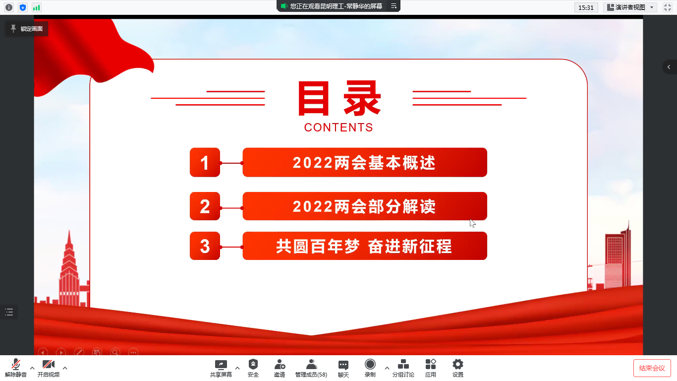 常老师代领与会同志共同学习了“两会”的基本概念,学习了2022年全国两会的总体情况。重点解读了李克强总理在政府工作报告中提及的教育相关的内容。“促进教育公平与质量提升。”“落实立德树人根本任务。”“着力保障和改善民生,加快发展社会事业。”等与教育相关的内容为大家留下了深刻的印象。