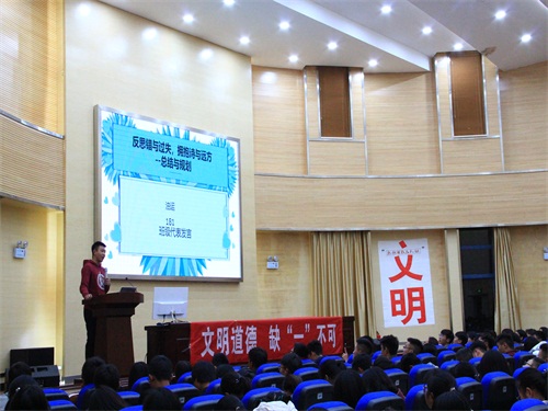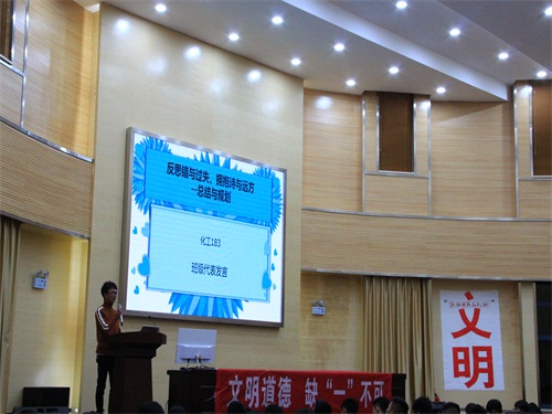 首先,由各班级班委代表发言,以发现问题、解决问题、反思过错、总结规划四个方面为主要内容,汇报开学以来班级各方面的基本情况,并承诺在接下来的学习生活中实行自己的监督职责。