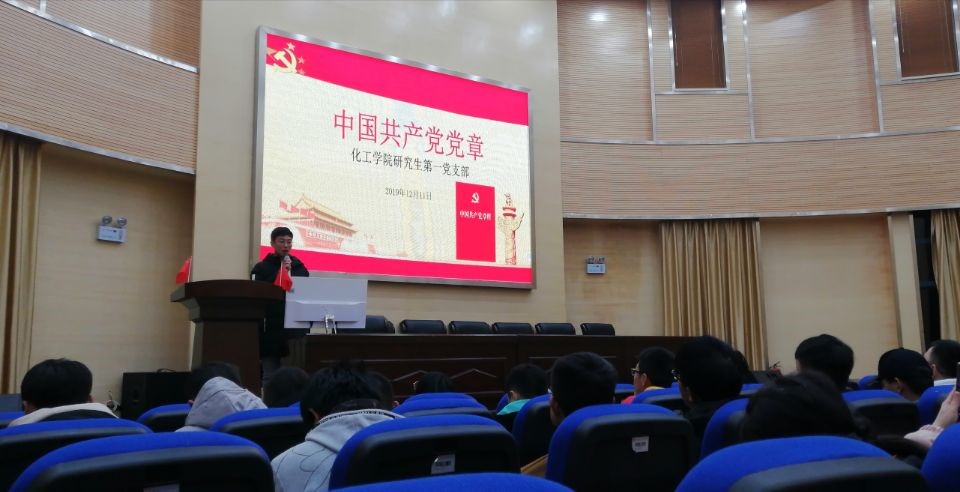 2019年12月11日晚上7:00,化工学院研究生第一、二、三党支部于化工楼100报告厅开展“为大家讲解党员发展程序相关问题”培训。大会由第三党支部书记江梦同志主持,参会人员有第一党支部书记韩涛同志、第二党支部书记母维宏同志、第三党支部书记江梦同志以及全体入党申请人和入党积极分子。