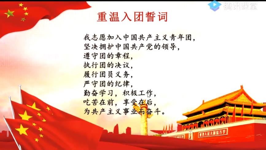 我志愿加入中国共产主义青年团,坚决拥护中国共产党的领导,遵守团的章程,执行团的决议,履行团员义务,严守团的纪律,勤奋学习,积极工作,吃苦在前,享受在后,为共产主义事业而奋斗。
