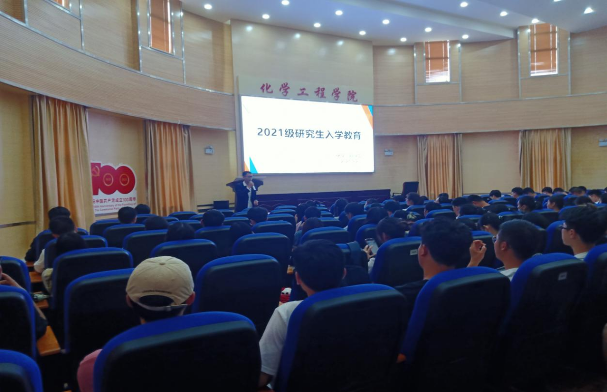2021级研究生入学教育在化工楼100报告厅举行。本次会议按班级分两批进行,何洁、胡天丁、李金成三位老师,学生支部书记唐玲玲等三位支部书记,学院研究生会李江琴等负责人出席,全体2021级研究生参加,会议由何洁老师主持。
