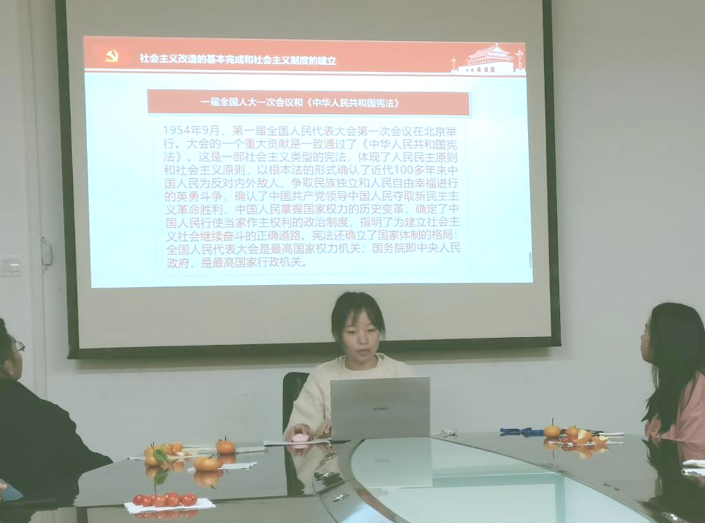 首先,田世垚老师分享阅读《毛泽东邓小平江泽民胡锦涛关于中国共产党历史论述摘编》阅读心得,让我们了解更多有关党的历史,并从中汲取经验,内化“经验”于心,外化“坚持”于行。接着高紫馨同学、许慧同学、刘思琪同学、柴欣蕊同学分别分享《中国共产党简史》第一章“中国共产党的创建和投身大革命的洪流”,第二章“掀起土地革命的风暴 ”,第三章“全民族抗日战争的中流砥柱 ”和第五章“中华人民共和国的成立和社会主义制度的建立”。读懂党史,才能深刻理解历史和人民为什么选择中国共产党,感悟了其中精髓,也就能锤炼过硬的素质,保持初心与使命,永葆鲜红色彩。