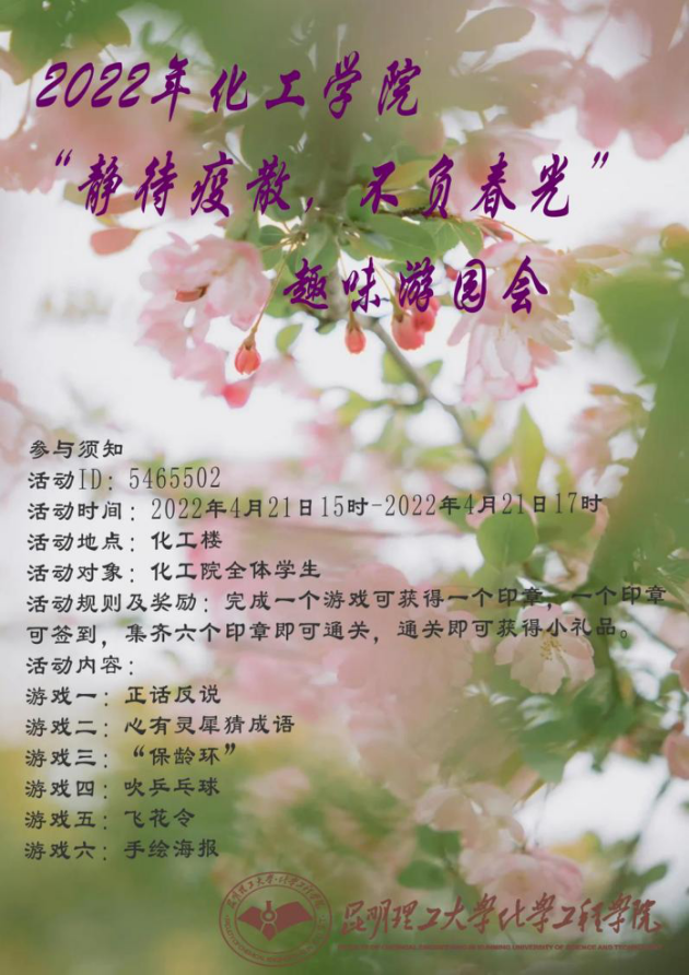 2021年4月21日15点,色色视频 于化工楼前空地开展了“静待疫散,不负春光”趣味游园会,色色视频 共90余名化工青年参与了此次活动。