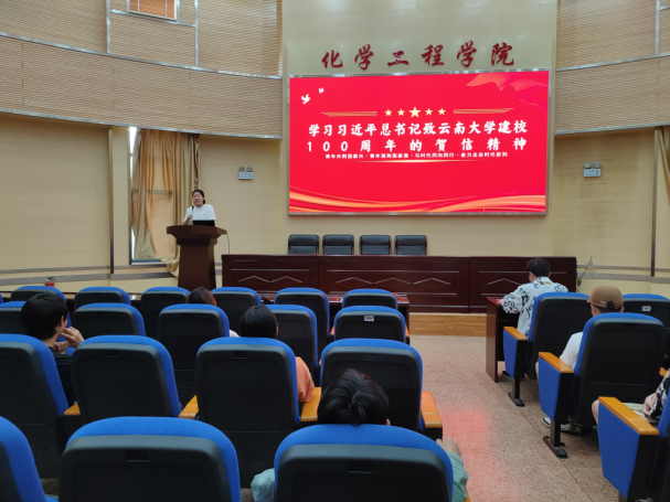 2023年4月27日16:00,学院团委书记李凯宇、团委赵振涛老师、各班级团支书、各学生组织成员于化工楼100报告厅集中学习“习近平总书记致云南大学建校100周年”的贺信精神。习近平总书记致云南大学建校100周年的贺信体现了以习近平同志为核心的党中央对西南边疆民族地区的亲切关怀,蕴含着对云南高校担当教育报国使命的厚望重托。习近平总书记的贺信,不仅仅是对云南大学的肯定,也是对各高校的嘱托。