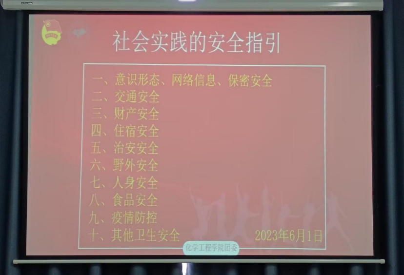 学院团委书记李凯宇老师就意识形态、网络信息、保密安全,交通安全,财产安全,住宿安全,治安安全,野外安全,人身安全,食品安全,卫生安全,共计十一项安全内容等向同学们进行讲述,并就注意事项和应急措施两方面为同学们进行了详细讲解,让同学们更清楚的了解了有关社会实践活动和校园活动应注意的安全事项,引导同学们在社会实践和校园活动中多加注意自身安全,保护好自己。
