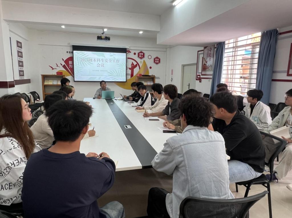 于憬园6122活动室召开2024级本科生安全工作会议,会议由辅导员田世垚主持,2024级本科生班长、安全信息员、心理委员等学生干部参会。会议围绕“在校安全”与“五一假期安全”两大主题展开,强调安全无小事,要求全体学生强化安全意识,筑牢安全防线,学生干部更应以身作则,带头落实管理制度。