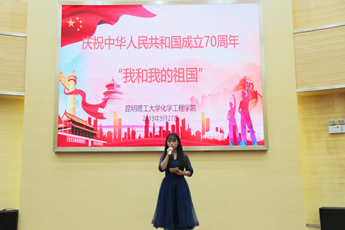 于9月27日19:00点在化工楼100报告厅举行了“我和我的祖国”庆祝活动。学院党委书记齐毅老师、院长梅毅教授,党委副书记李云燕老师、副院长李斌教授、装控系主任宋鹏云教授、生物质工程系主任彭林才教授、班主任及老师代表们出席,2019级全体学生参加。