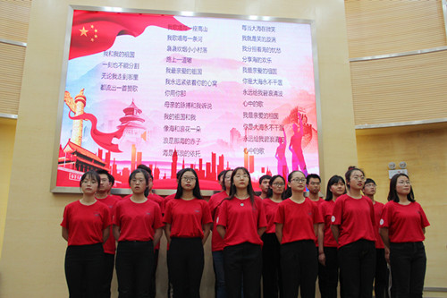 活动伊始,老师与同学们面向国旗,同唱国歌;之后师生共同观看视频,重温开国大典;麦浪老师与同学们演唱歌曲《我爱你,中国》,表达了对祖国的热爱和尊敬;杨敏和高新翔同学用独特新颖的方式讲述了“两弹元勋”邓稼先的生平事迹,体现了为祖国鞠躬尽瘁、无私奉献的爱国主义精神;张云波同学通过对中国伟大工程的介绍,展现了以习近平同志为核心的党中央治国理政的伟大实践;慷慨激昂的朗诵《我们的70年》,展示了70年来伟大祖国在中国共产党领导下,励精图治、艰苦奋斗、改革开放的发展成果。