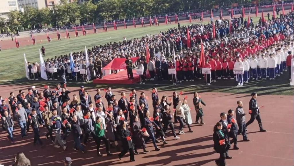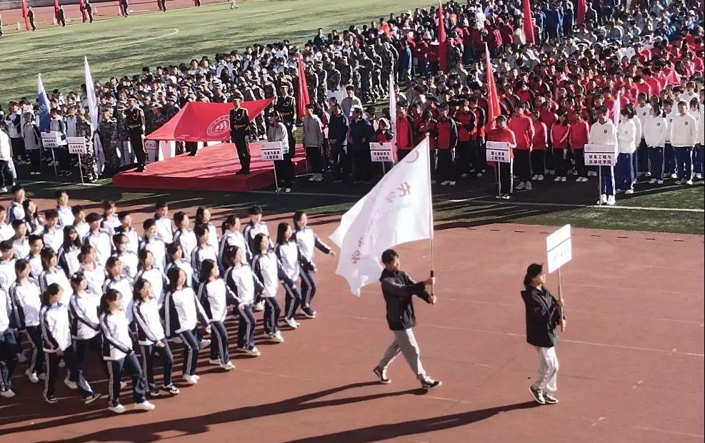 教职工代表及学生代表组成的方阵走过主席台接受检阅,斗志昂扬的精神面貌和蓬勃向上的校园生活相得益彰。