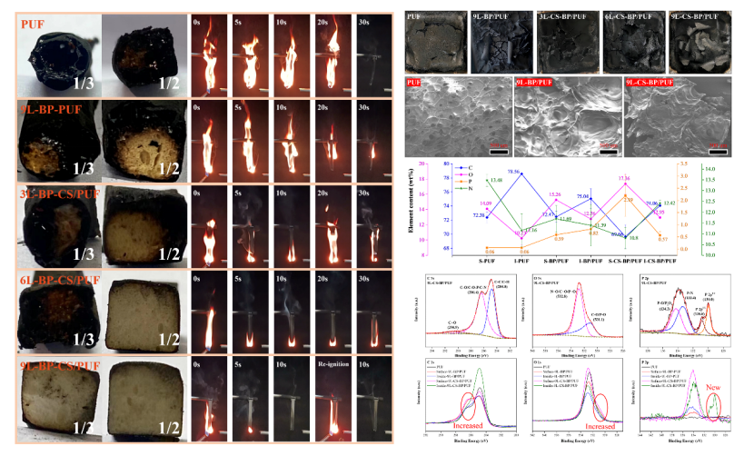 磷化工团队在黑磷基协效阻燃体系的设计、应用和协效机理研究中取得最新进展。采用静电自主装的方法制备了一种由壳聚糖和黑磷纳米片组成的新型表面阻燃涂层(CS-BP)。CS-BP涂层通过氢键和静电相互作用紧紧粘附在聚氨酯泡沫表面,在不影响泡沫力学性能的前提下,有效提高了泡沫的防火安全性,并赋予了其优异的光热转换性能。系统对比了燃烧前后泡沫表面和内部的元素组成和化学结构,揭示了CS-BP阻燃涂层在表面的催化碳化行为和协效机制。结果表明,CS-BP在泡沫表面形成具有大量的P-O-C结构和磷酸衍生物的碳层,新碳层有效抑制了内部泡沫的热氧化降解过程。在气相方面,CS的改性延长了BP热解过程中含磷化合物释放的温度范围并增加了燃烧过程中不燃气体的释放,协同增强了阻燃涂层的气相阻燃性。本研究为提高BP基阻燃体系的阻燃效率和扩大其应用范围提供了新的思路。
