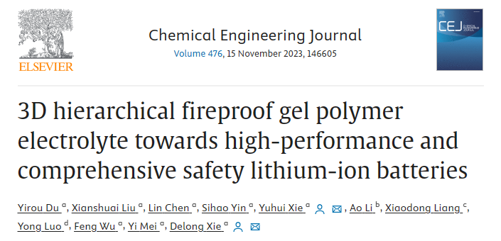 上述研究成果以“3D hierarchical fireproof gel polymer electrolyte towards high-performance and comprehensive safety lithium-ion batteries”为题发表在化学工程领域知名期刊Chemical Engineering Journal上。论文第一作者为磷化工团队2020级博士研究生杜依柔,色色视频