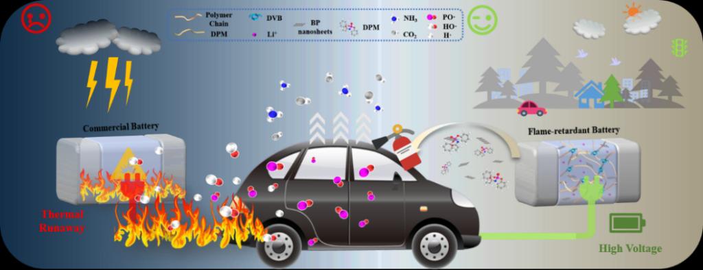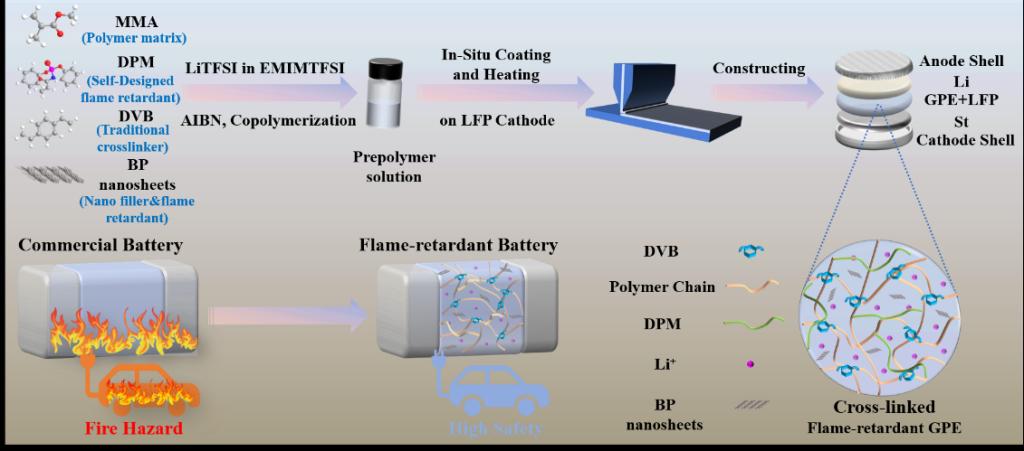 磷化工团队提出了一种新的设计理念,即基于P-N协效阻燃的3D交联复合GPE。通过引入磷烯、自主研发的阻燃剂(DPM)及其带有的电负性功能团,策略性地调控聚合物骨架的分级结构,实现了Li+的双重加速传导和高效阻燃性能。开发的复合GPE具有较高的室温Li+传导率(1.263 mS cm-1,20 ℃),良好的氧化稳定性(5.42 V vs. Li+/Li),并改善了Li+的传输能力(Li+迁移数达到0.53)。基于复合GPE的电池(LFP||Li、NCM||Li和LFP||石墨)在1 C倍率下表现出可优异的可逆容量保持率和库伦效率。研究进一步通过分子轨道能级和密度泛函理论(DFT)计算,揭示了Li+与聚合物基体的相互作用机制。