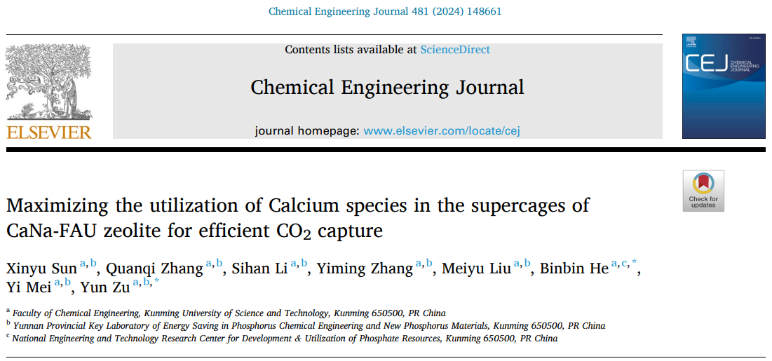 上述研究成果以《Maximizing the utilization of Calcium species in the supercages of CaNa-FAU zeolite for efficient CO2capture》为题发表在化学工程领域TOP学术期刊《Chemical Engineering Journal》上。色色视频